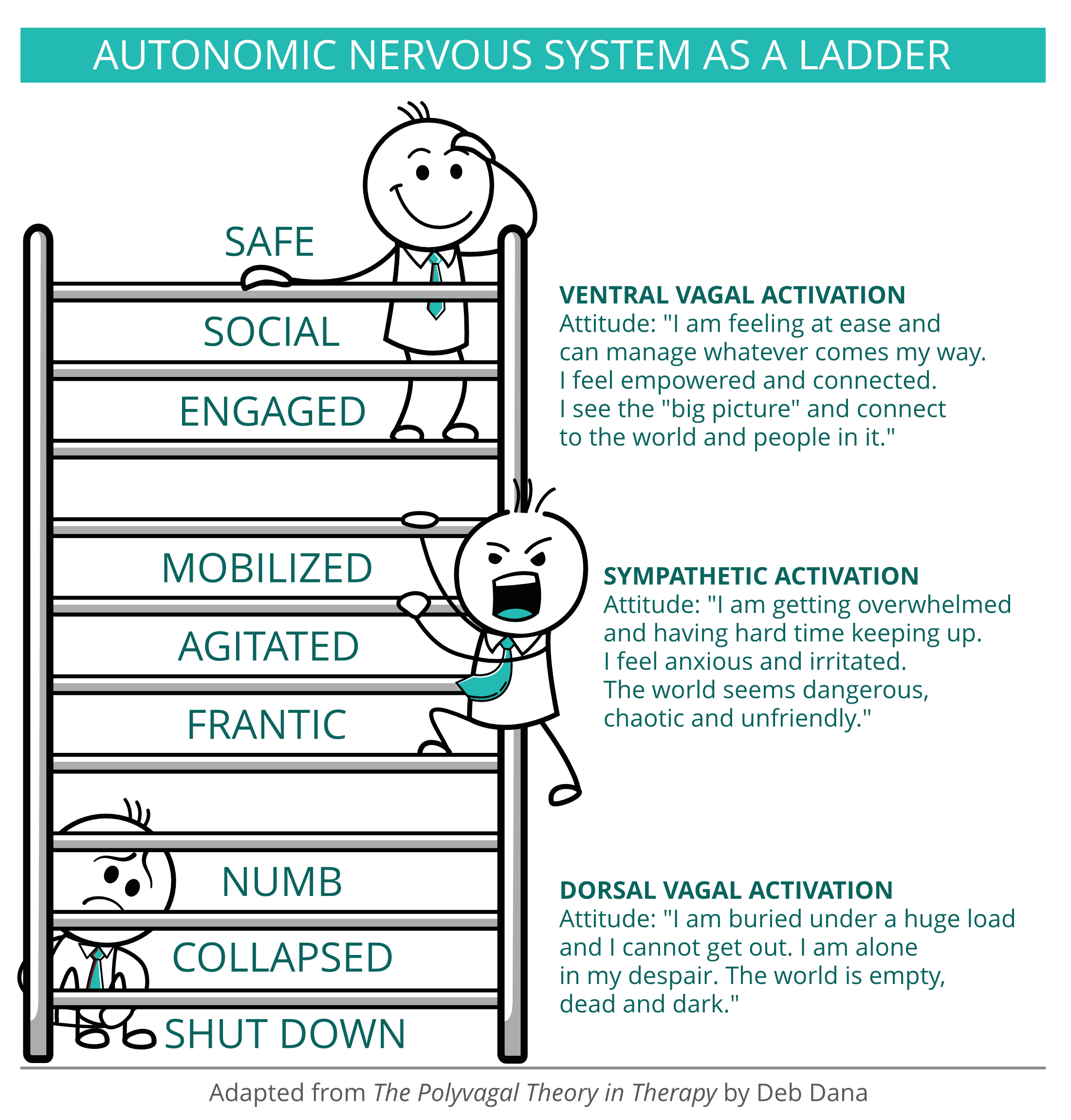 Deb Dana’s Polyvagal Ladder is a helpful way to understand your nervous system and figure out how to work with it—not against it. Let’s break it down: